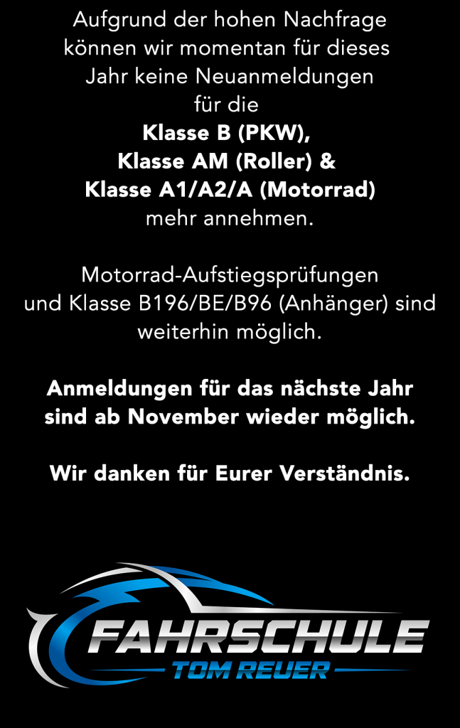 Eine Anmeldung zu unseren Kursen muss immer persönlich im Büro erfolgen, damit Eurer Platz im Theoriekurs auch gesichert ist.